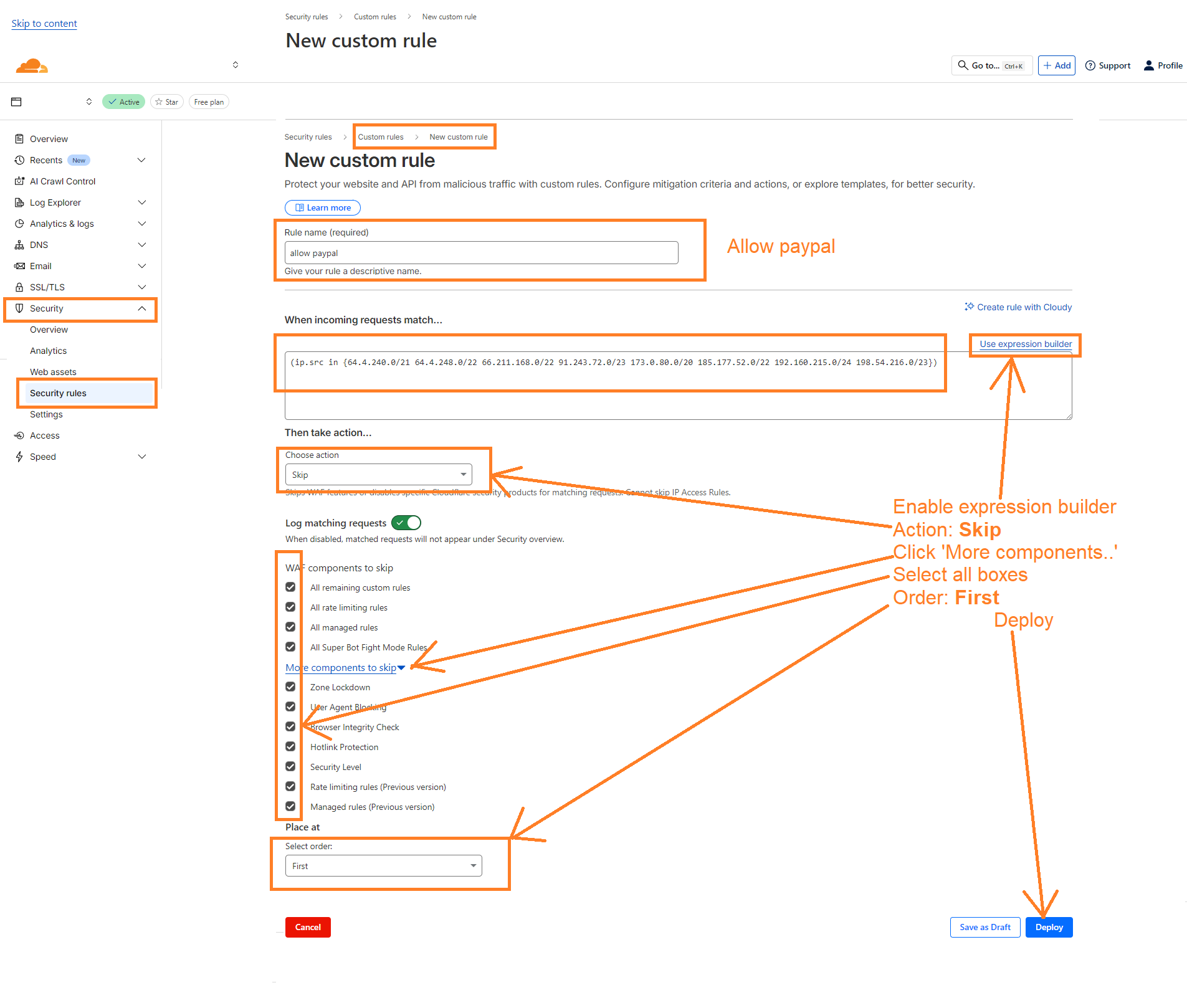 Then setup things as on screenshot below. Expression for PayPal IPs from moment I publish this post (you can get current Paypal IP here: https://www.paypal.com/us/cshelp/article/what-are-the-internet-protocol-ip-addresses-for-paypal-server-endpoints-ts1056 ):